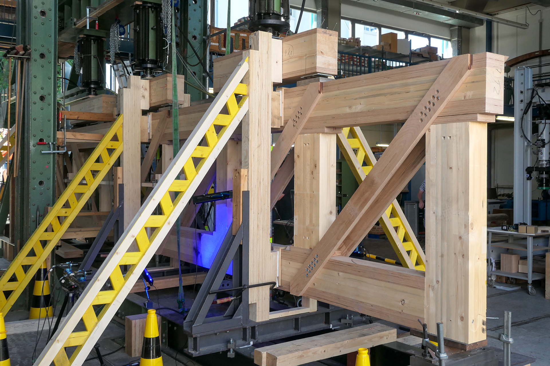 In Versuchen analysierten die Experten zunächst die Belastbarkeit der einzelnen Bauteile und Anschlusspunkte des Fachwerkträgers. Vermittels Berechnungen und Simulationen ermittelten sie u. a. die Auswirkungen von Zug-, Druck- und Biegemomenten und prüften die Rotationssteifigkeit mit verschiedenen Schraubentypen hergestellter Anschlussverbindungen.