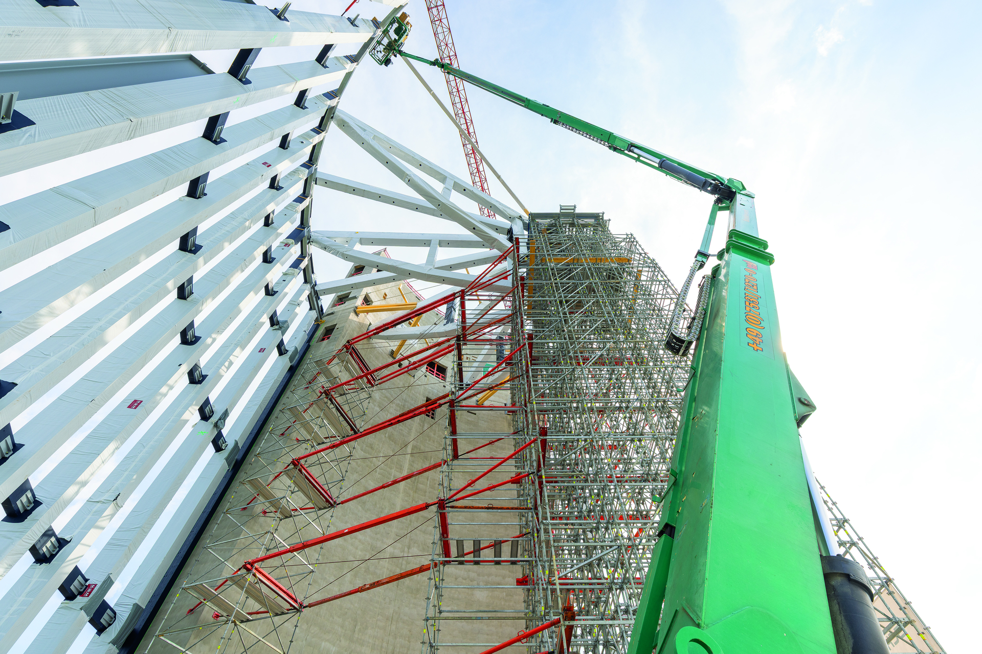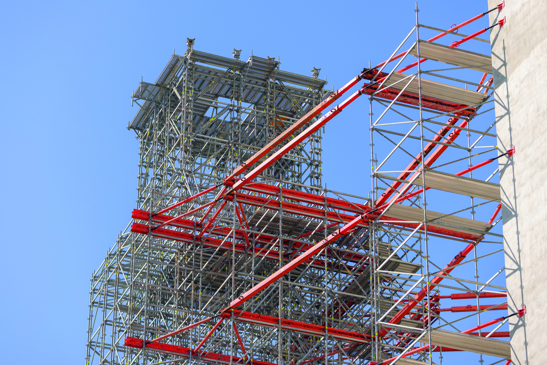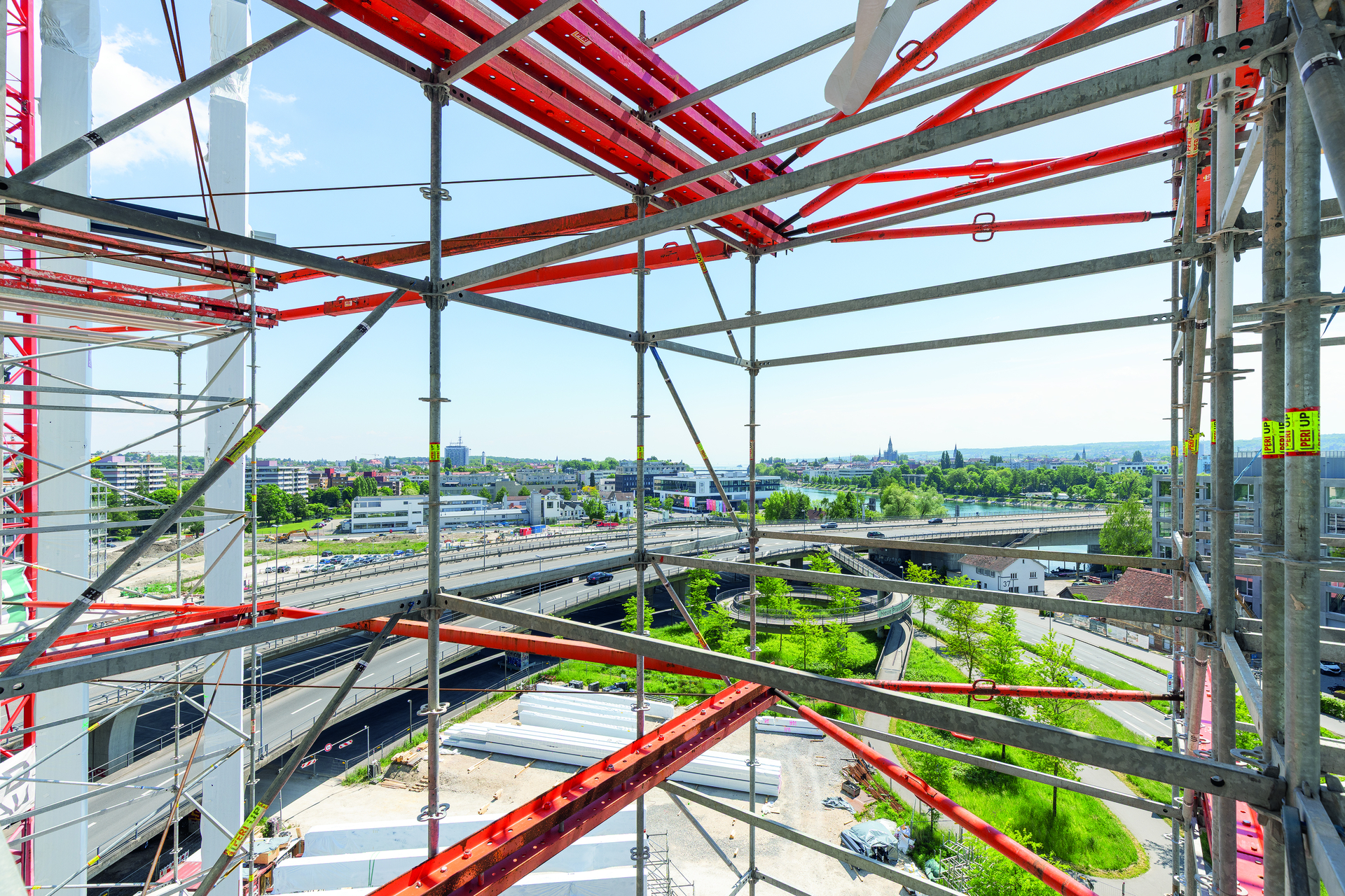 Mittels Systembauteilen des VARIOKIT Ingenieurbaukastens wurden fünf Aussteifungsebenen ausgebildet, die Horizontallasten konnten dabei zuverlässig in den außenliegenden Stahlbetonkern abgeleitet werden. Gleichzeitig hielt die trotz der rund 1.400 kN Traglast äußerst schlank ausgeführte Gerüstkonstruktion die Sockelebene frei für die notwendigen Hubarbeitsbühnen.
