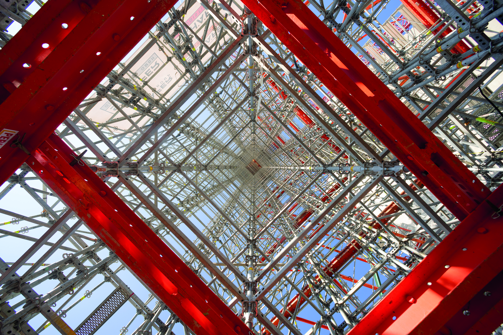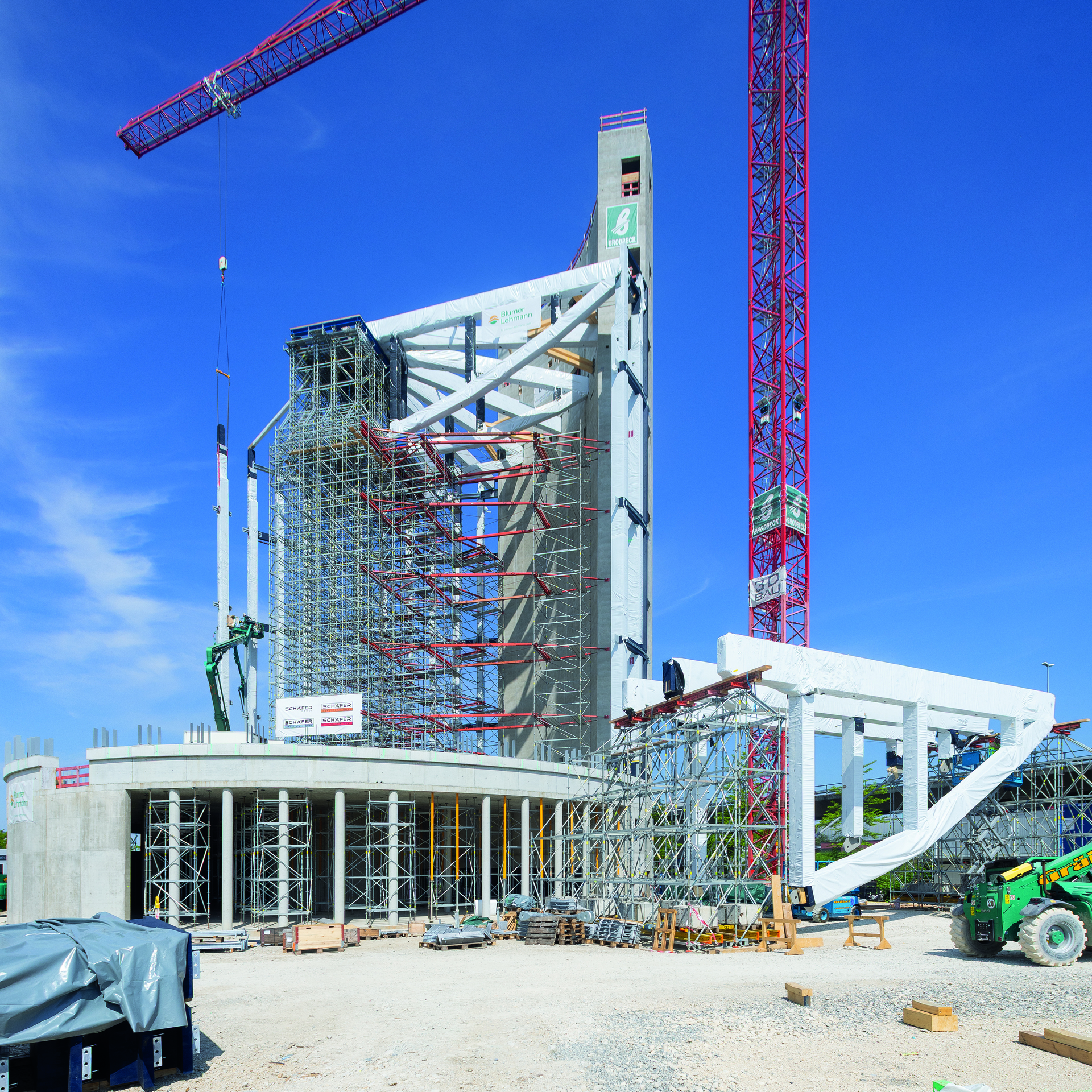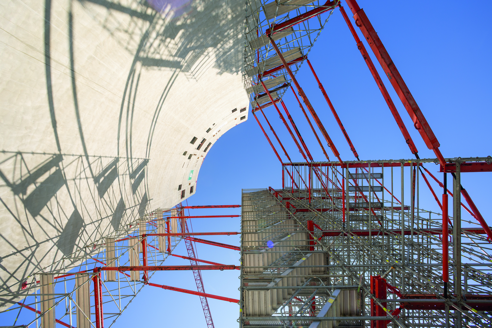 Mittels Systembauteilen des VARIOKIT Ingenieurbaukastens wurden fünf Aussteifungsebenen ausgebildet, die Horizontallasten konnten dabei zuverlässig in den außenliegenden Stahlbetonkern abgeleitet werden. Gleichzeitig hielt die trotz der rund 1.400 kN Traglast äußerst schlank ausgeführte Gerüstkonstruktion die Sockelebene frei für die notwendigen Hubarbeitsbühnen.