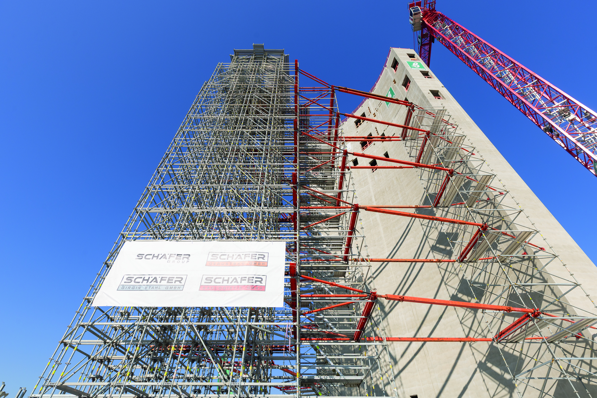 Die weitestgehende Materialbereitstellung und nur 2-wöchige Gerüstmontage erfolgte durch die Schäfer Gerüstbau GmbH. Foto: PERI Deutschland