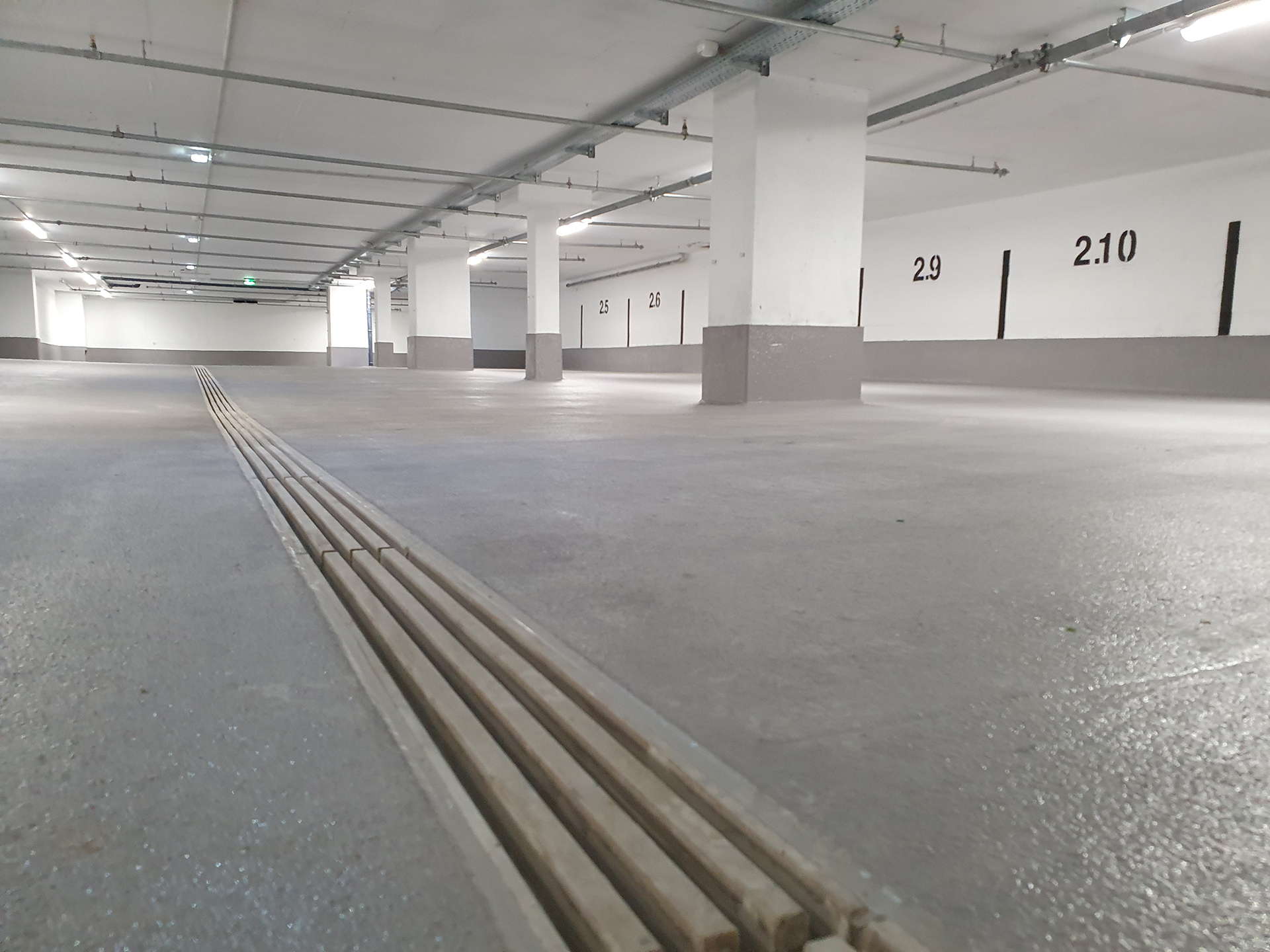 Parallel zu den Hochbaumaßnahmen wurde die zweigeschossige Tiefgarage umfassend saniert. Nach Chloriduntersuchungen erfolgte der Betonabtrag im Hochdruck‑Wasserstrahl‑Verfahren. Die freigelegte Bewehrung wurde gereinigt und je nach Schädigungsgrad ergänzt.