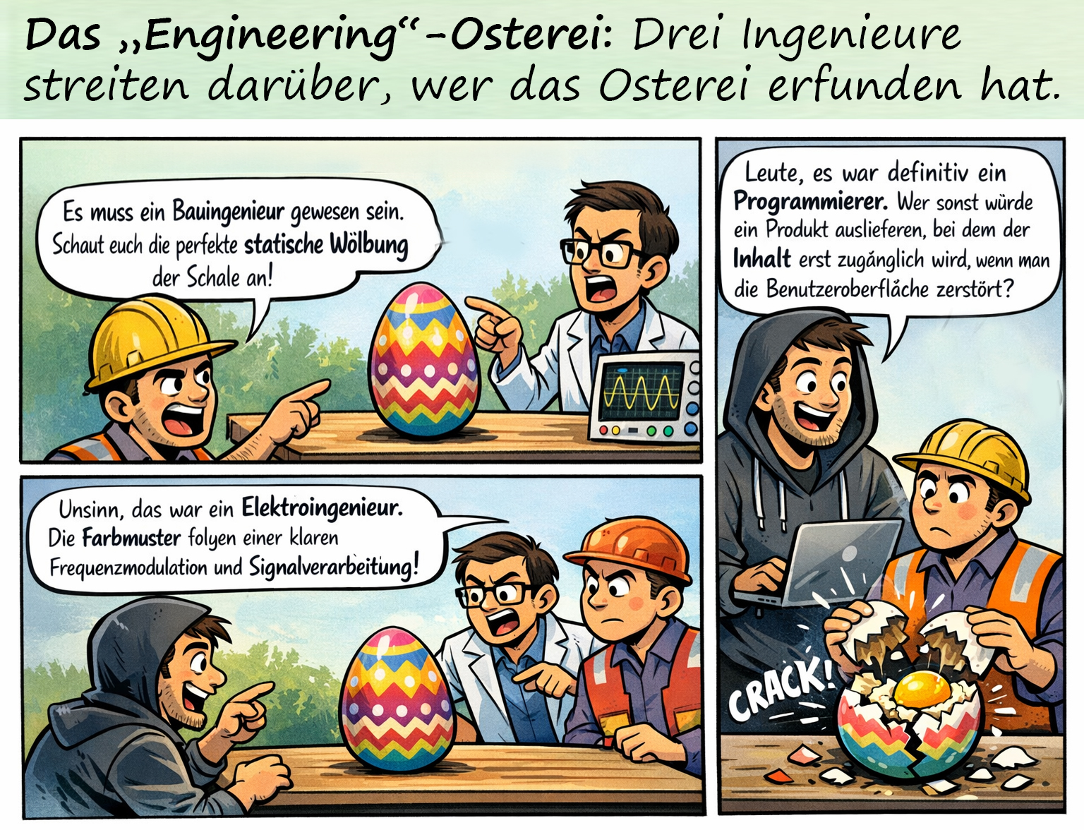 Das „Engineering“-Osterei: Drei Ingenieure streiten darüber, wer das Osterei erfunden hat.