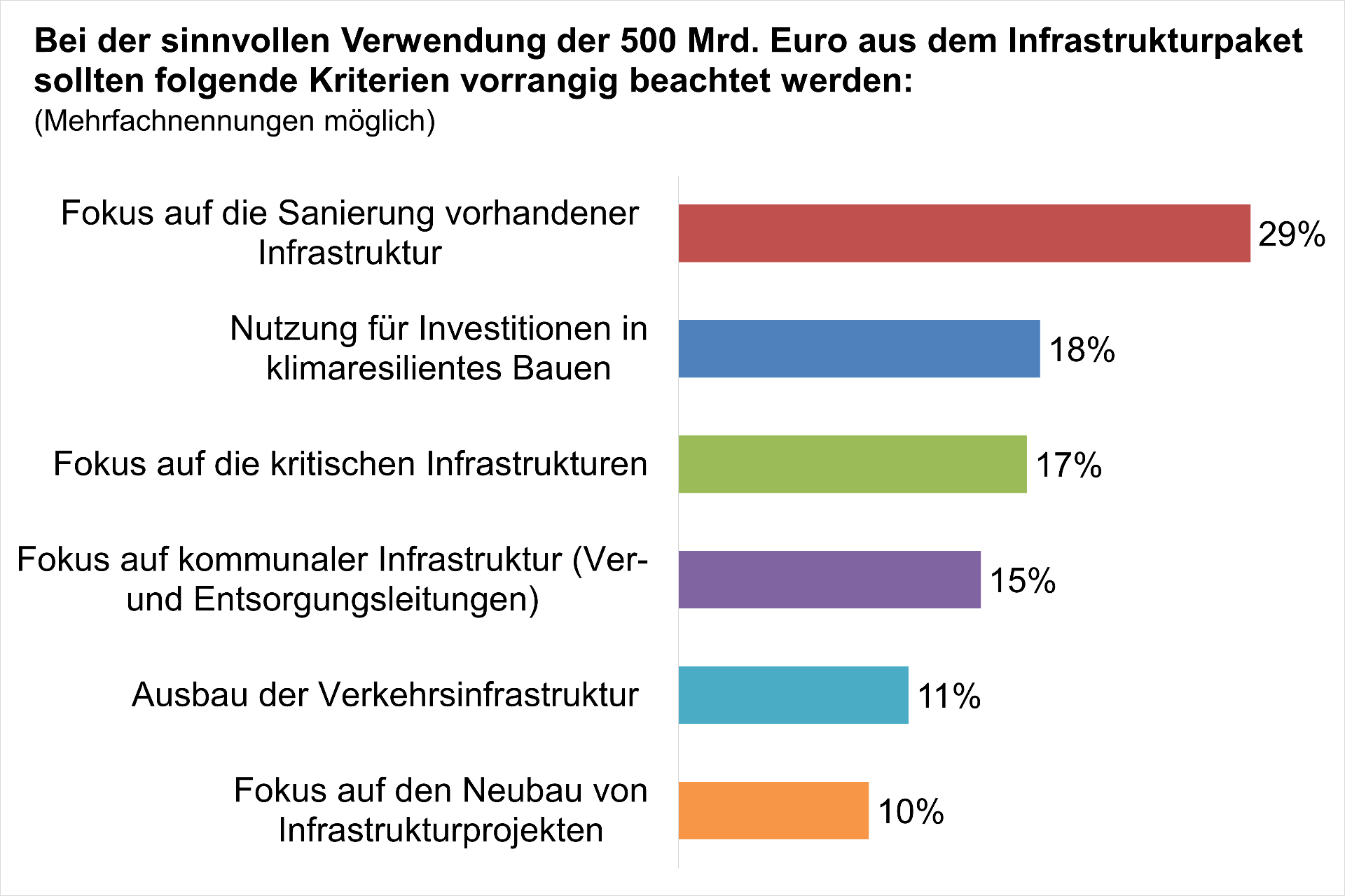 500 Mrd. Euro will die Bundesregierung in den kommenden Jahren in Infrastrukturen und Verteidigung investieren. Die Bayerische Ingenieurekammer-Bau hat in einer Umfrage unter ihren Mitgliedern ermittelt, wo die Expertinnen und Experten für den Bau den größten Investitionsbedarf sehen. Klares Ergebnis: Die Sanierung vorhandener Infrastrukturen muss Vorrang haben.