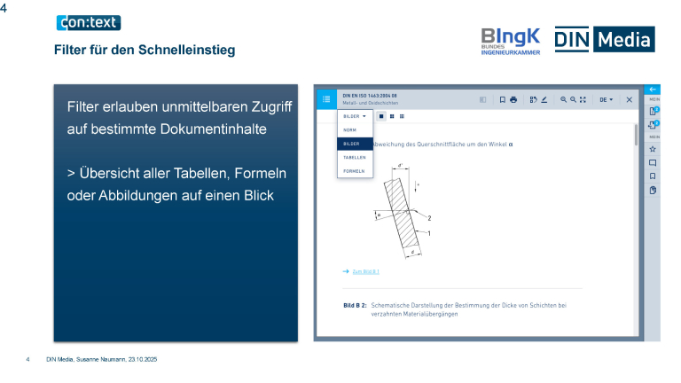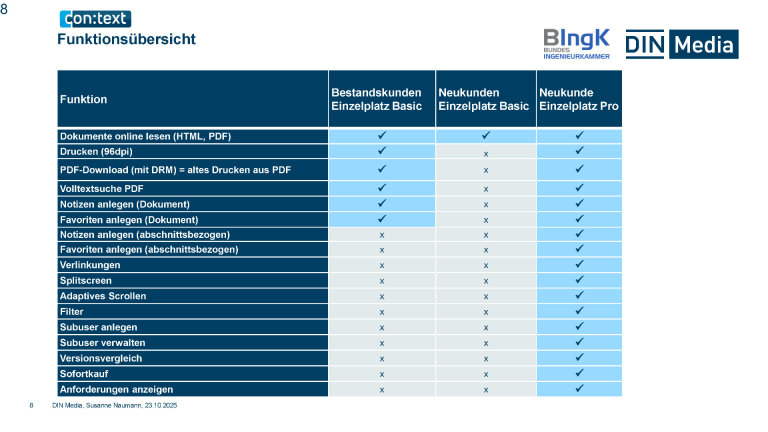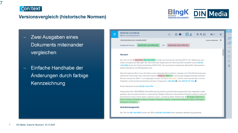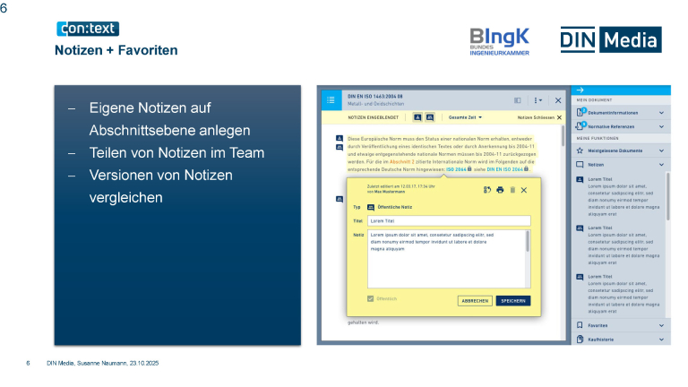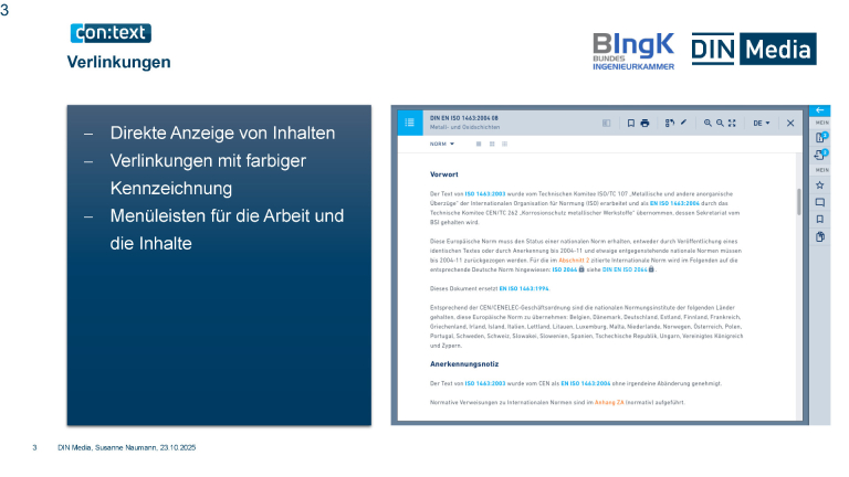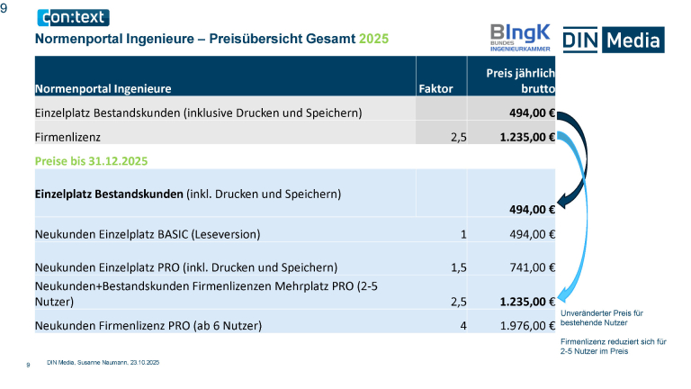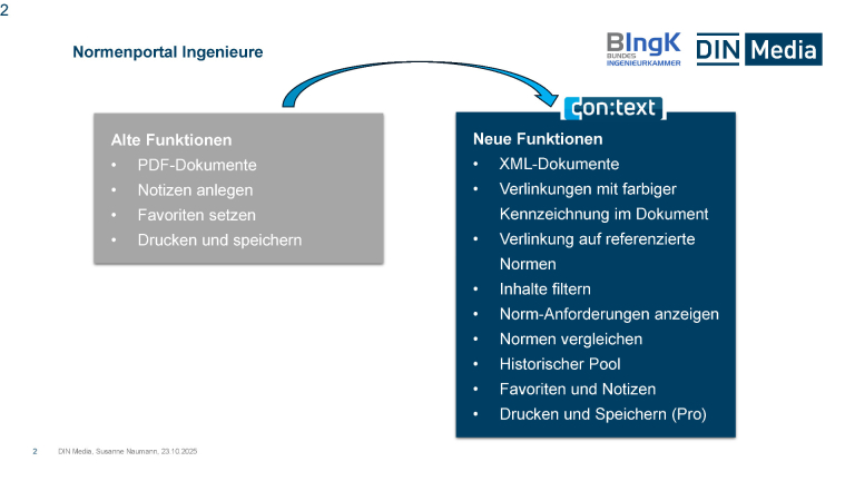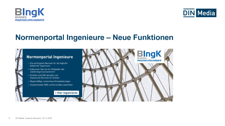 Auf Grundlage einer Rahmenvereinbarung der Bundesingenieurkammer mit der DIN Media GmbH (ehemals Beuth Verlag) stehen den Mitgliedern der Länderkammern mit dem Normenportal für Ingenieure rund 500 für das Ingenieurwesen relevante aus allen Fachbereichen vergünstigt zur Verfügung. Das Normenportal wurde jetzt anwenderfreundlich auf XML-Dokumente mit neuen zusätzlichen Funktionen umgestellt und steht während eines 14-tägigen, kostenfreien Testzeitraums als Leseversion allen interessierten Kammermitgliedern zur Verfügung.