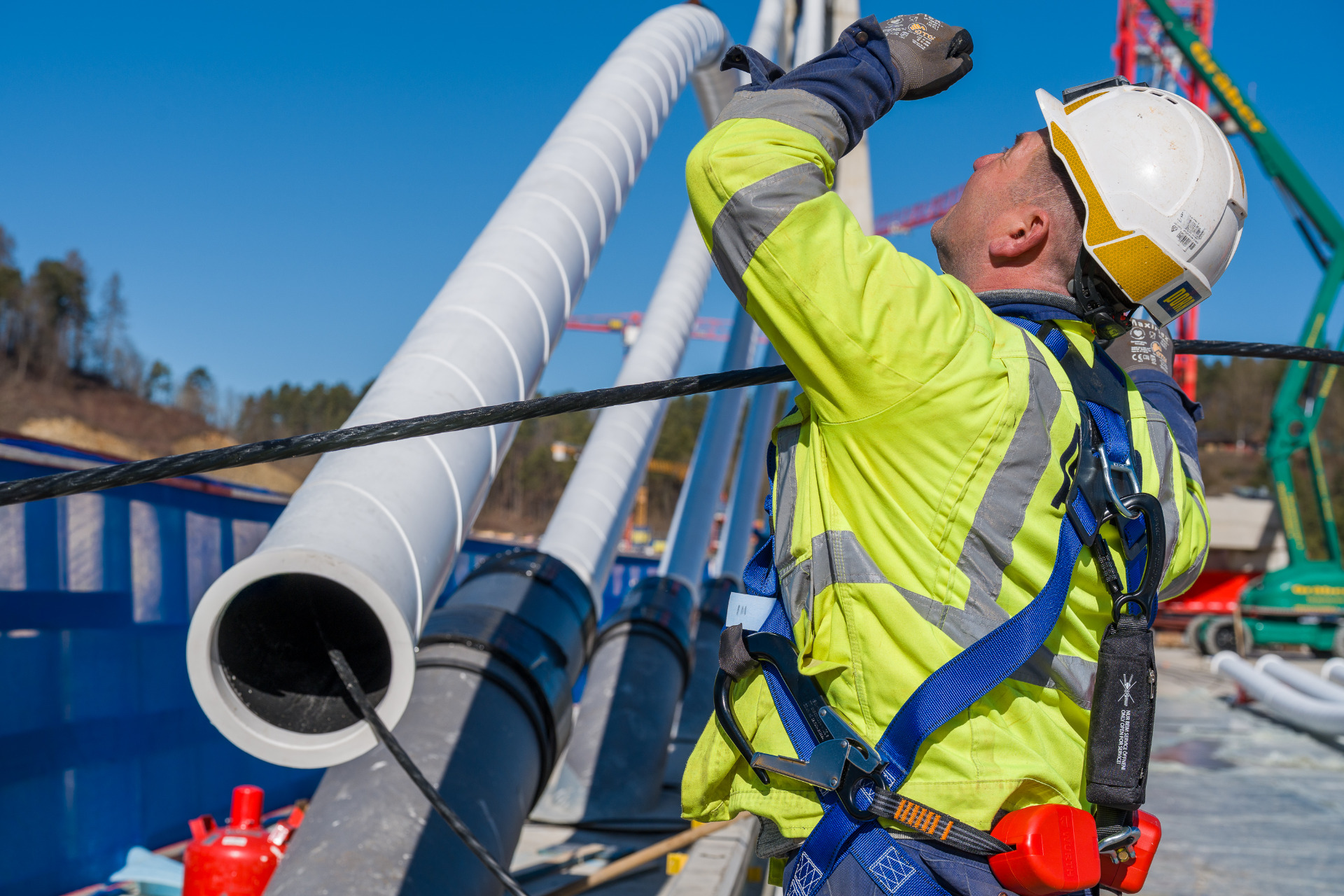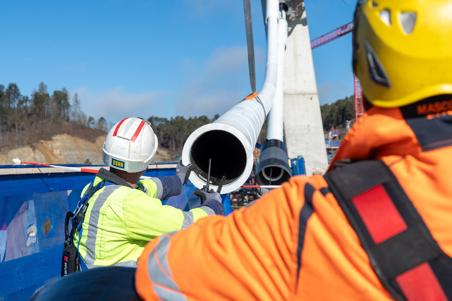 Hoch über dem Neckartal erreicht der Bau der Hochbrücke Horb einen Moment, der das Bauwerk erstmals als Ganzes sichtbar macht: Der Einbau der Schrägseile hat begonnen. Damit schreiten die Arbeiten an einem der zentralen konstruktiven Elemente der Brücke planmäßig voran. Aktuell liegt der Fokus auf der Herstellung des Überbaus und damit auf einem Bauabschnitt, der höchste Präzision und perfekte Abstimmung aller Gewerke erfordert.
